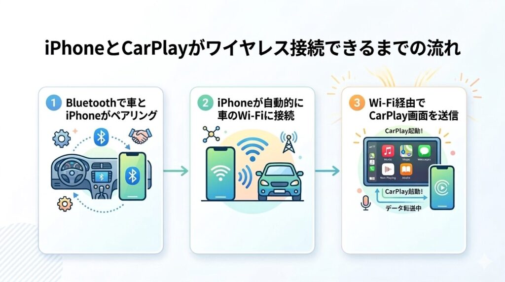 実は、ワイヤレスCarPlayは「Bluetooth」と「Wi-Fi」の両方を使って、以下の2段階で接続されています。
