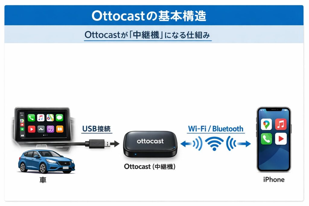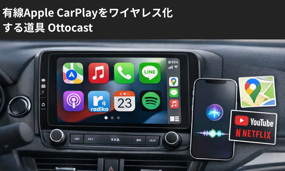 Ottocast(オットキャスト)は、車の純正CarPlayのワイヤレス化やAndroidアプリ、動画再生などを可能にする後付けデバイスです。特に「有線式CarPlayしか対応していない車」をワイヤレス化+機能拡張できる点が最大の特長です。